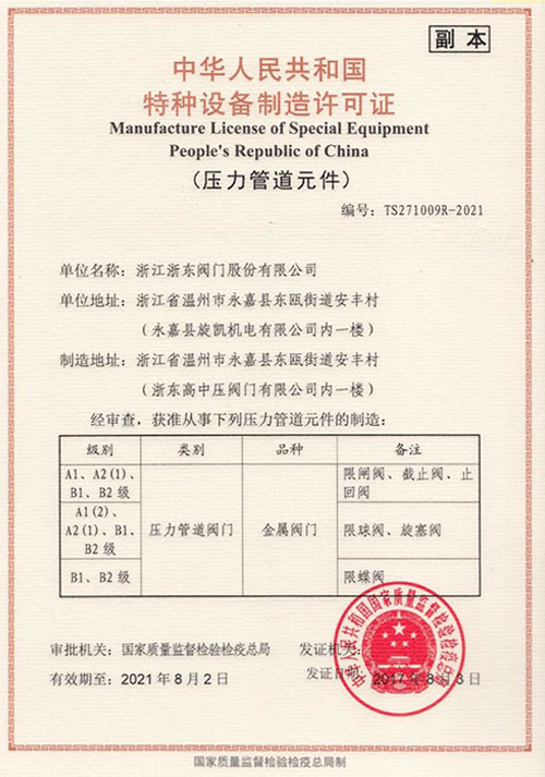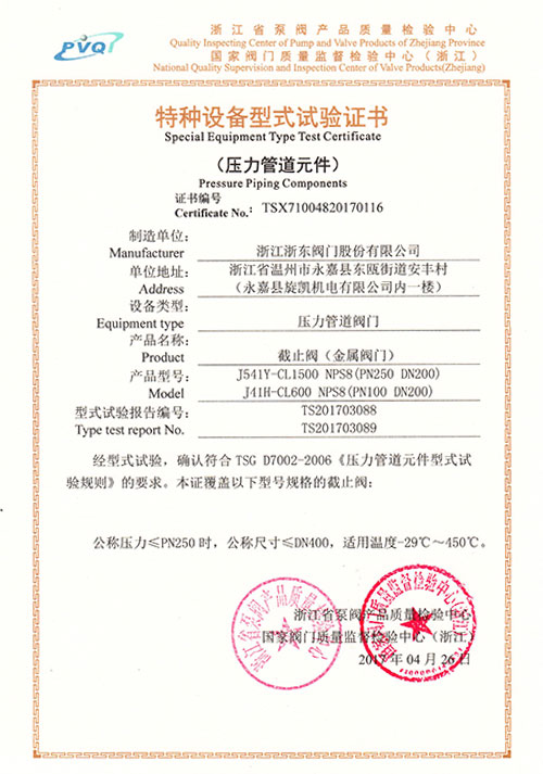 特種設備型式試驗證書-截止閥