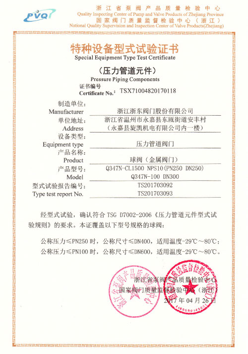 特種設備型式試驗證書-球閥