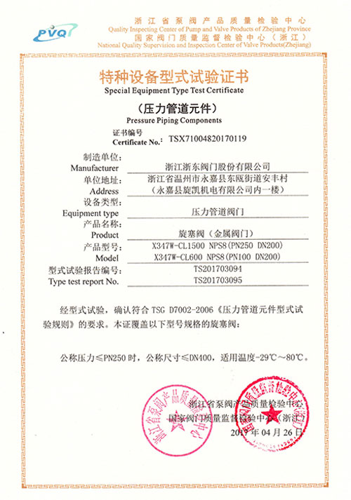 特種設備型式試驗證書-旋塞閥