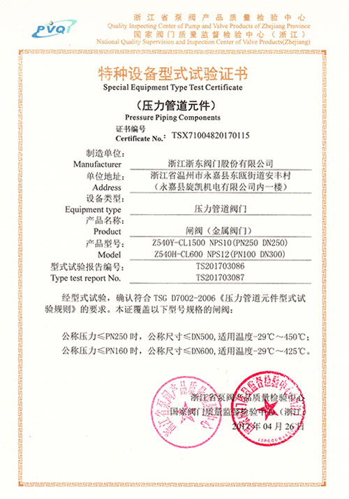 特種設備型式試驗證書-閘閥