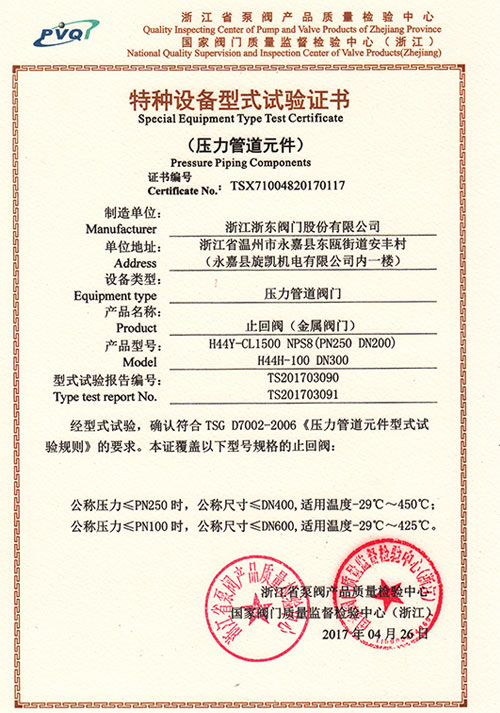 特種設備型式試驗證書-止回閥
